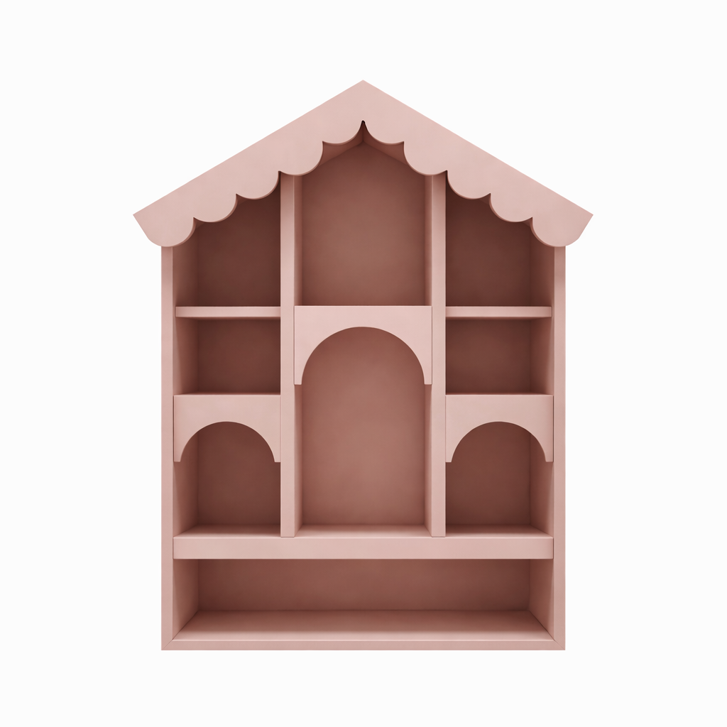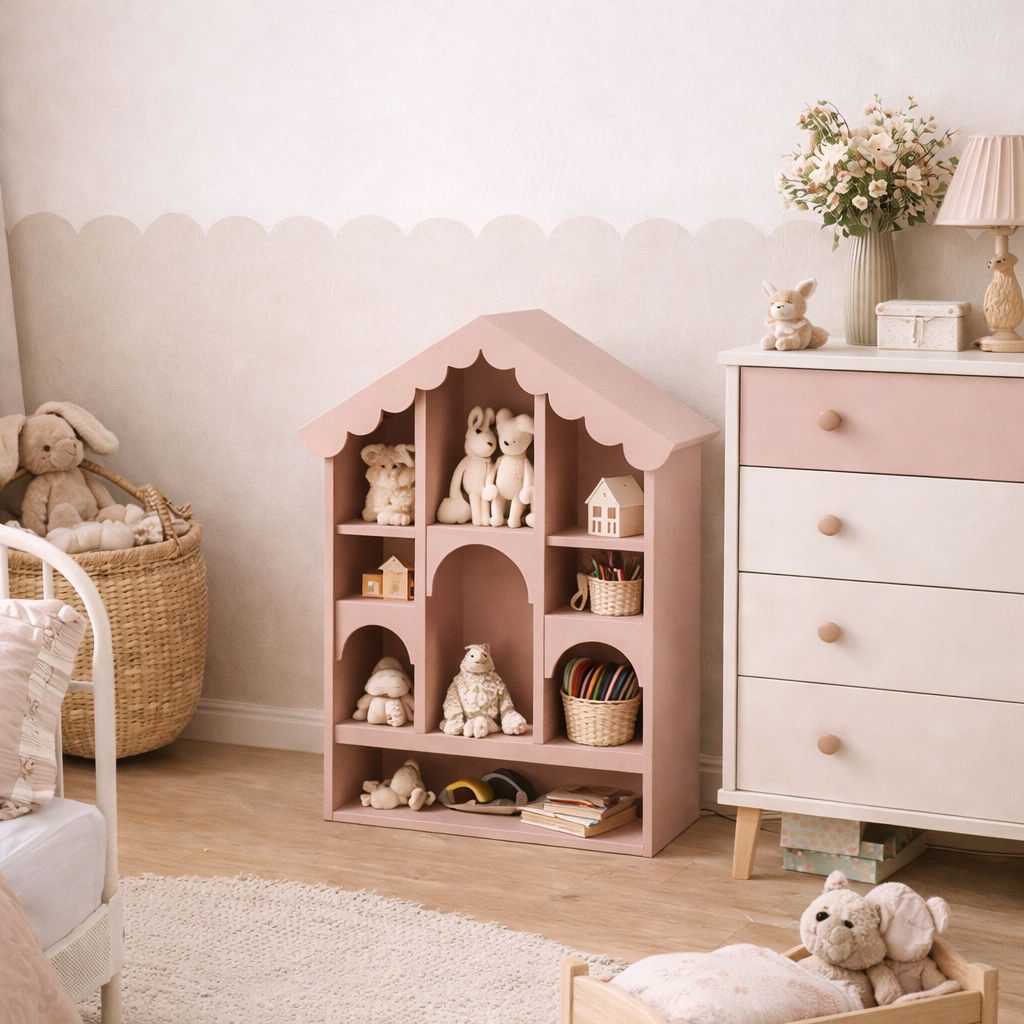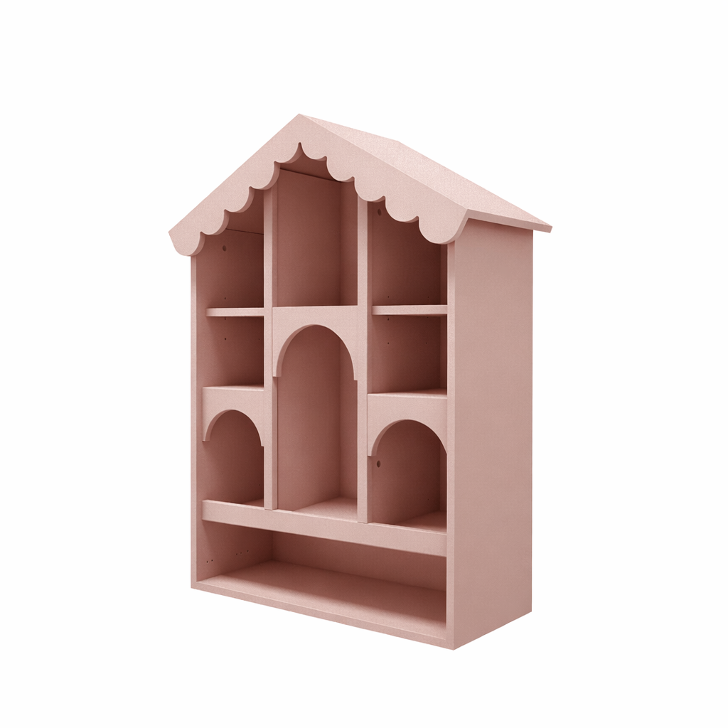 Oferujemy niepowtarzalny regał w formie domku, który stanowi doskonałe rozwiązanie 2w1. Może służyć zarówno jako miejsce do przechowywania książek oraz zabawek, jak i jako kreatywny domek dla lalek, stwarzając idealne warunki do zabawy. Starannie zaprojektowany układ półek umożliwia łatwe uporządkowanie i przechowywanie ulubionych przedmiotów malucha. Urokliwe detale, takie jak falbany na dachu i zaokrąglone przejścia, nadają mu bajkowy, niepowtarzalny styl.