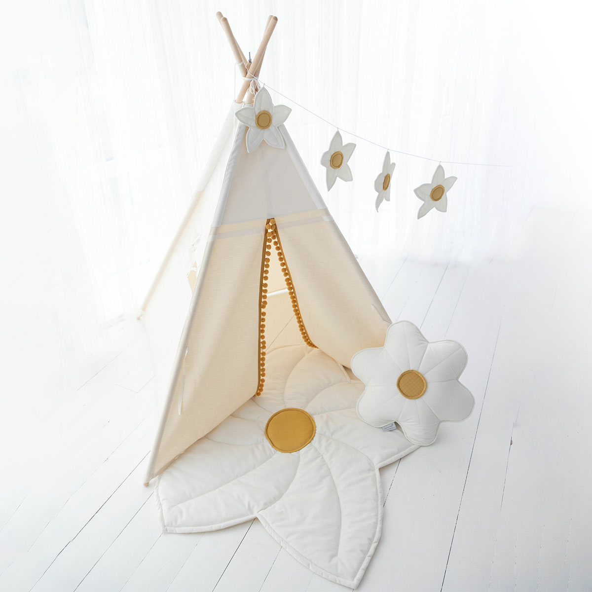 Namiot Tipi z serii Daisy to eleganckie, białe tipi z dekoracyjnymi, miodowymi pomponami. Wykonany z wytrzymałego płótna, zawiera aksamitną matę do zabawy, dużą kwiatową poduszkę oraz 200-centymetrową girlandę Daisy.