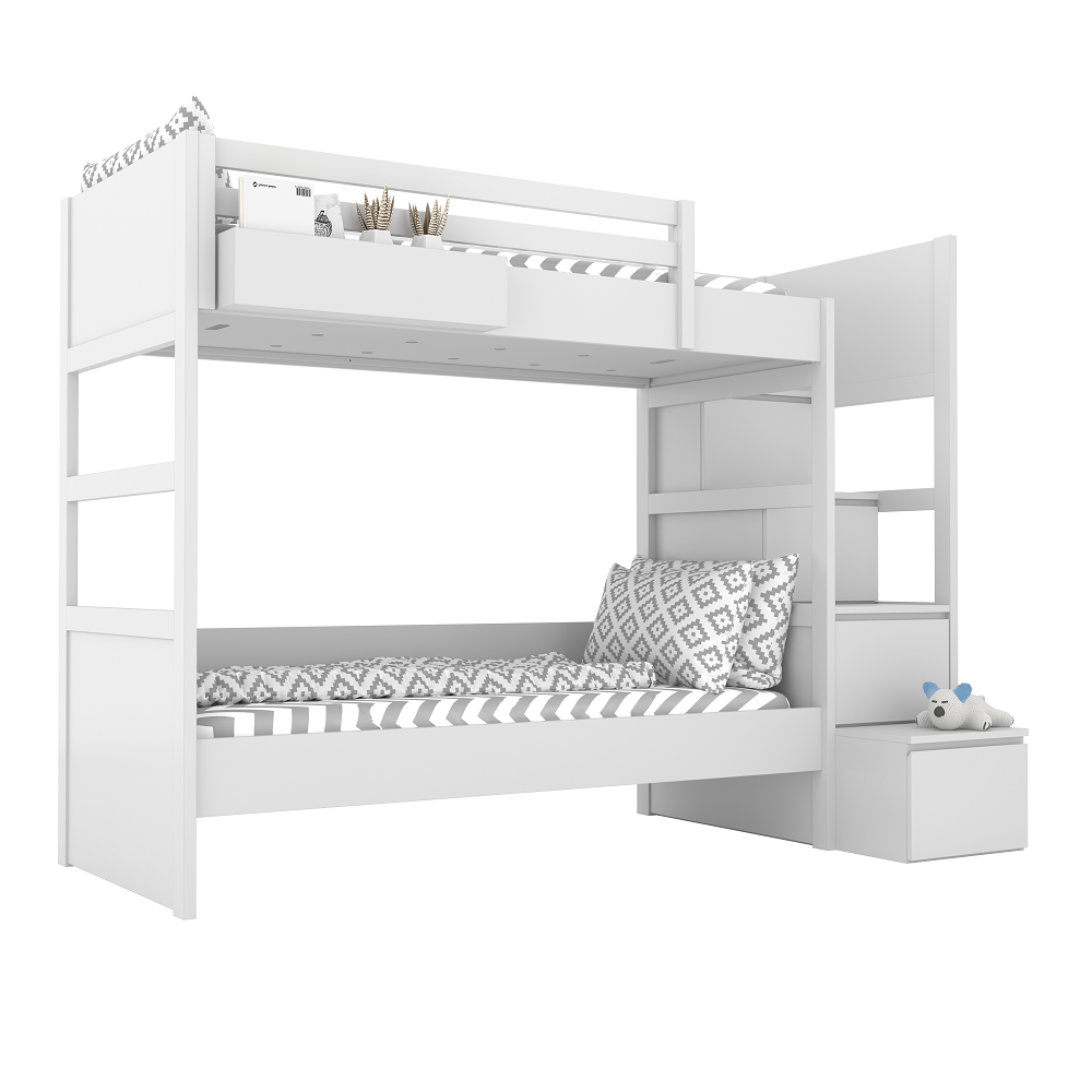 Drewniane Łóżko piętrowe ze schodami Biały Simone Bami