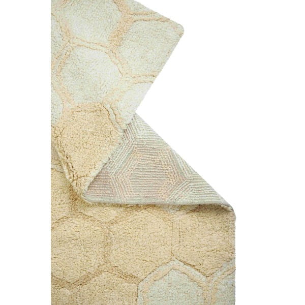 Unikalny design, który wykracza poza podstawy. Prostokątny bawełniany dywan w delikatnych odcieniach i reliefach, inspirowany naturalnym plastrem miodu tworzonym przez pszczoły. Dzięki zastosowaniu nici o mieszanych kolorach powstają subtelne niuanse kolorystyczne z lekkim efektem gradientu od kości słoniowej do złota, a sześciokątny wzór jest wykonany w reliefie, bawiąc się różnymi wysokościami runa, aby uzyskać bogatą teksturę. Inwestycja w jakość i styl, która przetrwa próbę czasu.