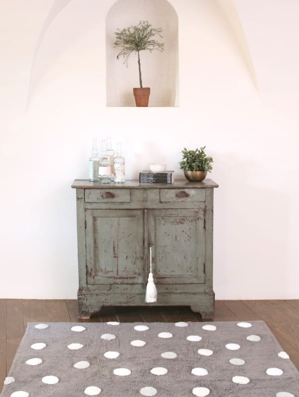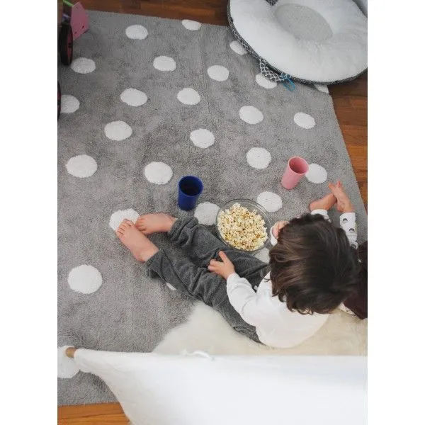 Dywan dziecięcy szary w białe kropki został wyprodukowany ręcznie w Indiach i wykonany w 97% z bawełny naturalnej oraz nietoksycznych barwników z myślą o najmłodszych użytkownikach. Kropki na dywanie to prawdziwy klasyk, wzór jest elegancki, a jednocześnie zabawny i nigdy nie wychodzi z mody. Produkt posiada szereg certyfikatów ISO 9001, ISO 14001 oraz ISO 18001, a także certyfikaty AITEX gwarantujące jakość wykonania w trosce o zdrowie i bezpieczeństwo użytkownika. Nada wnętrzu przytulności oraz nowoczesnego designu.
