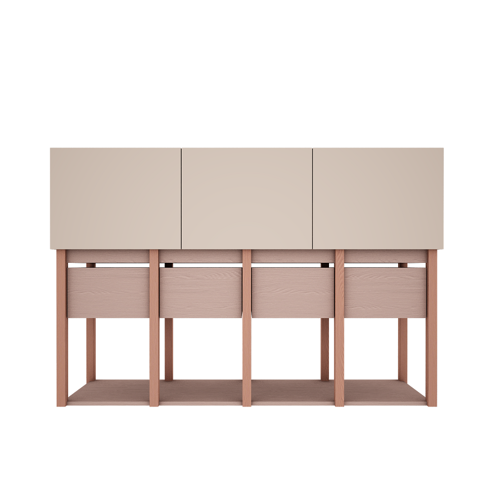 Komoda posiada 3 pojemne szuflady oraz3 szafki, które zostały wyposażone w system prowadnic z cichym domykiem. Na dole znajdziemy 3 półki.