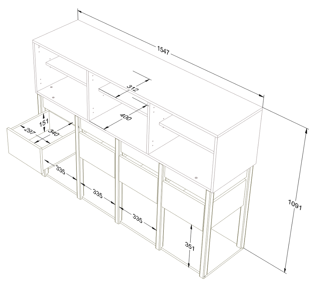 Komoda posiada 3 pojemne szuflady oraz3 szafki, które zostały wyposażone w system prowadnic z cichym domykiem. Na dole znajdziemy 3 półki.
