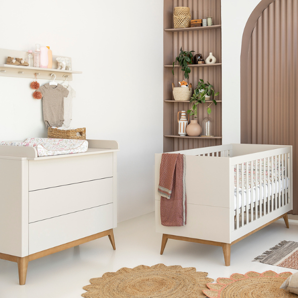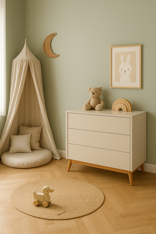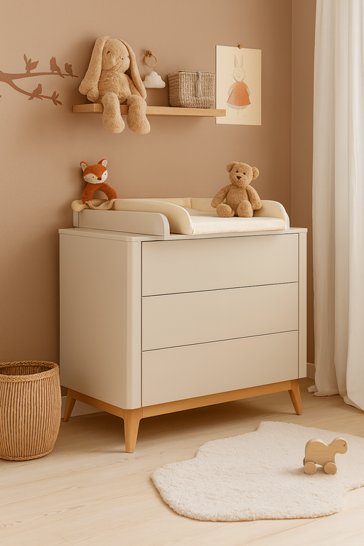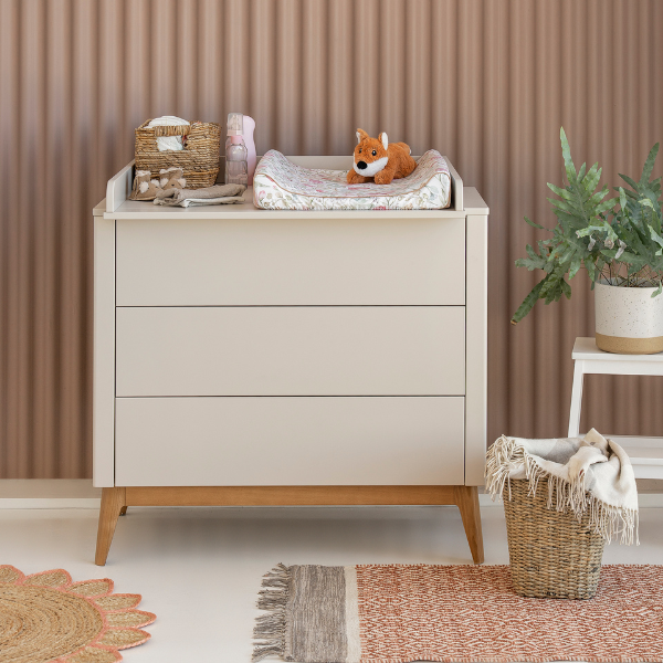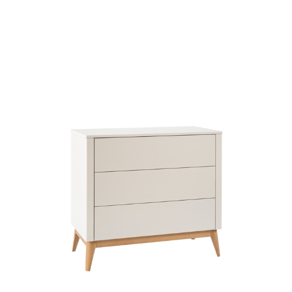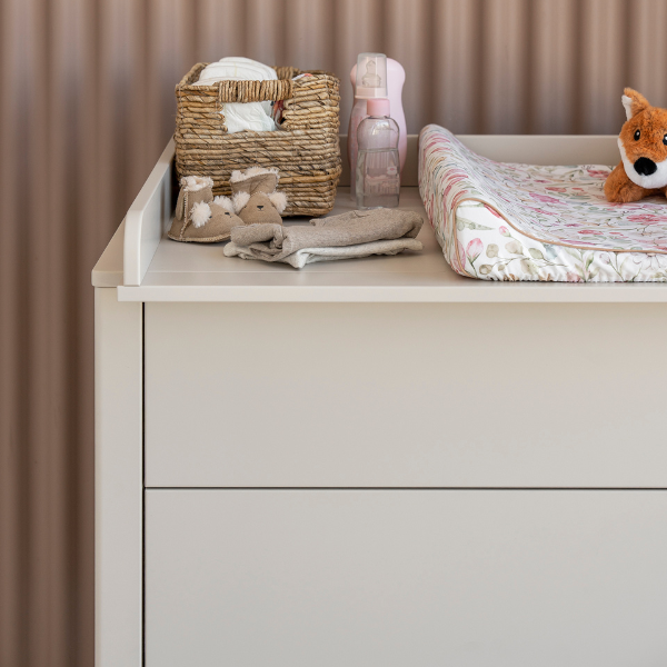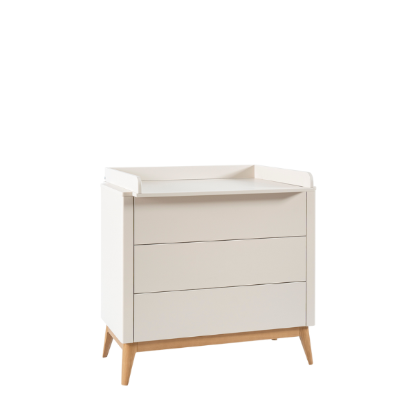 Nowoczesna komoda z trzema pojemnymi szufladami wyposażonymi w system push-to-open zapewnia wygodne i bezgłośne użytkowanie. Opcjonalnie można ją uzupełnić o praktyczną, demontowalną nakładkę do przewijania, która zwiększa funkcjonalność mebla w pokoju dziecka.
