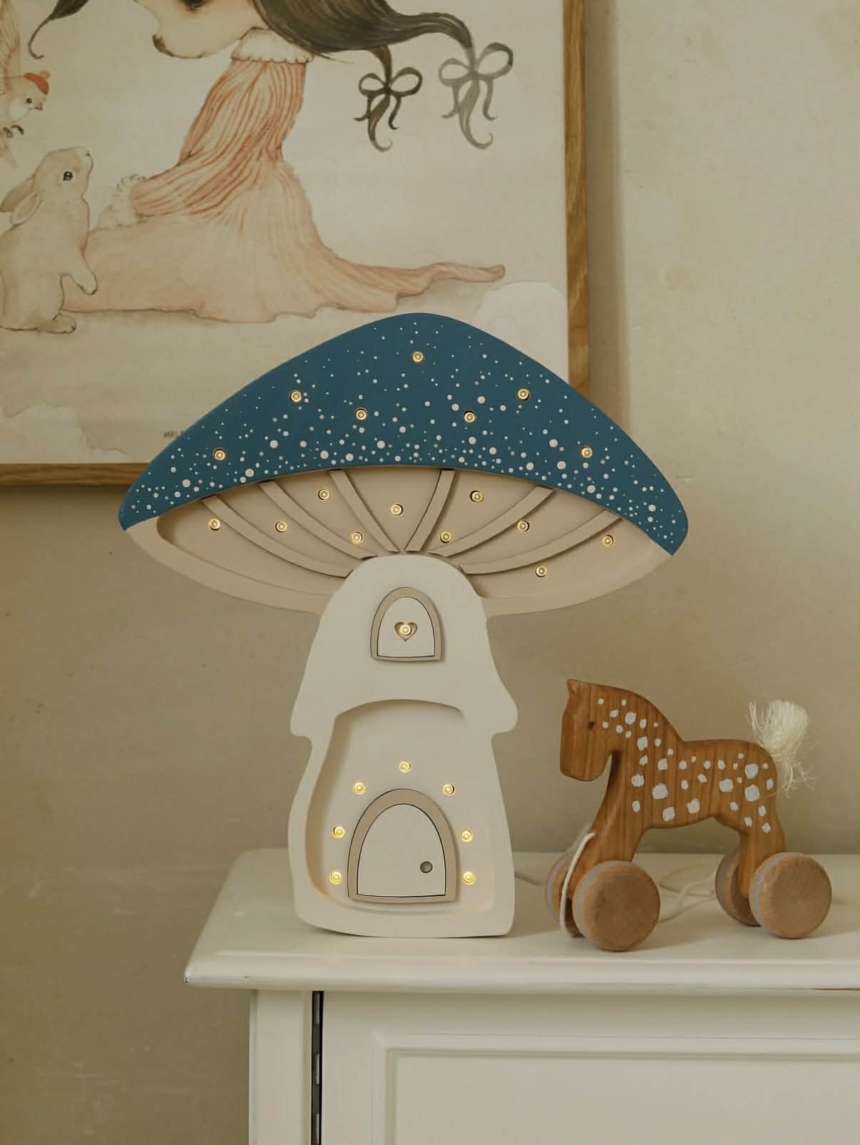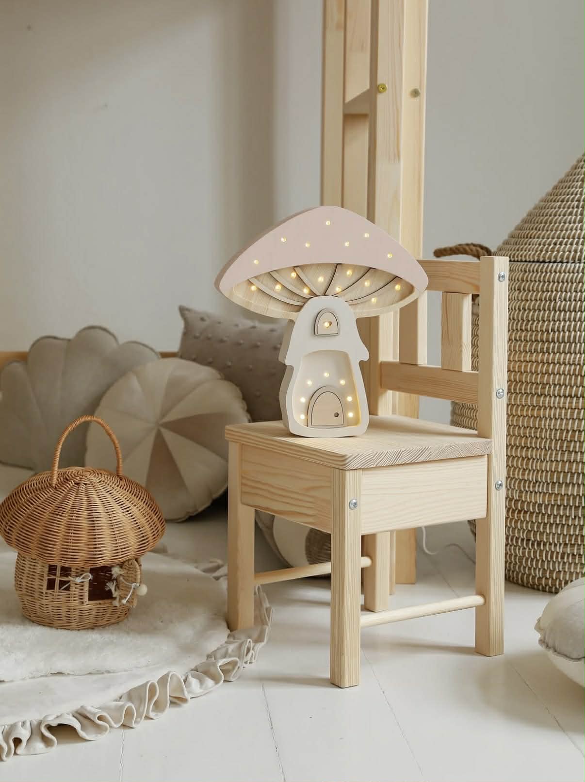 Lampka w kształcie grzybka to idealny wybór do wnętrz urządzonych w stylu leśnym, boho, Montessori oraz slow living. Jej subtelny design sprawia, że dziecięcy pokój zamienia się w zaczarowaną krainę – taką, w której mogłyby mieszkać leśne zwierzątka lub wróżki.
