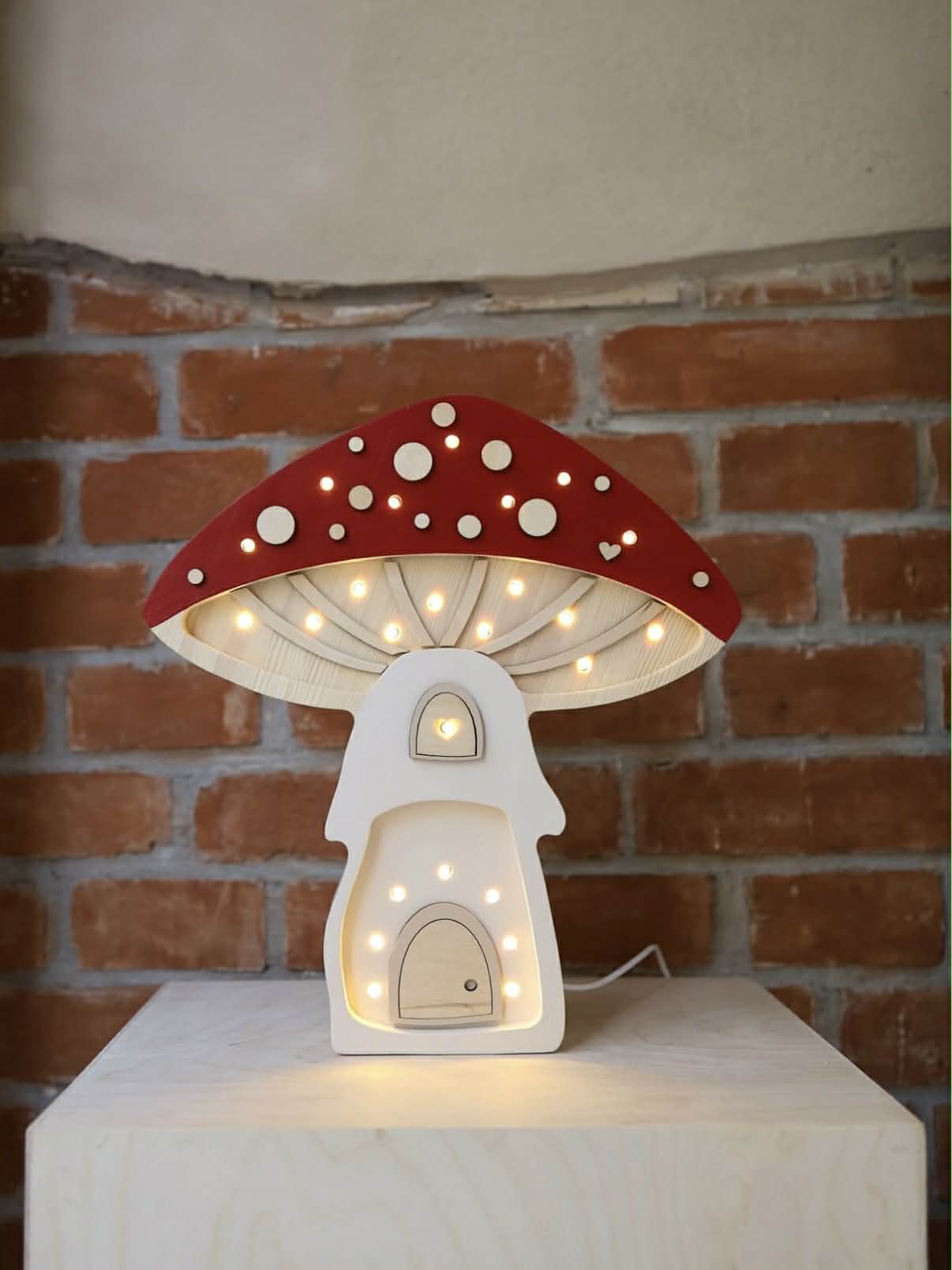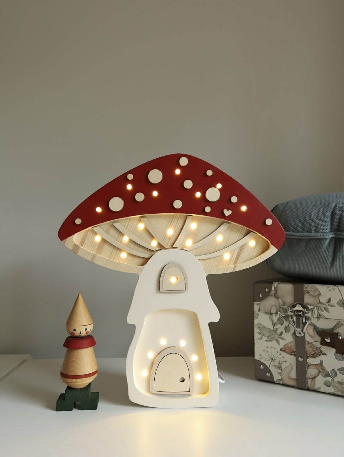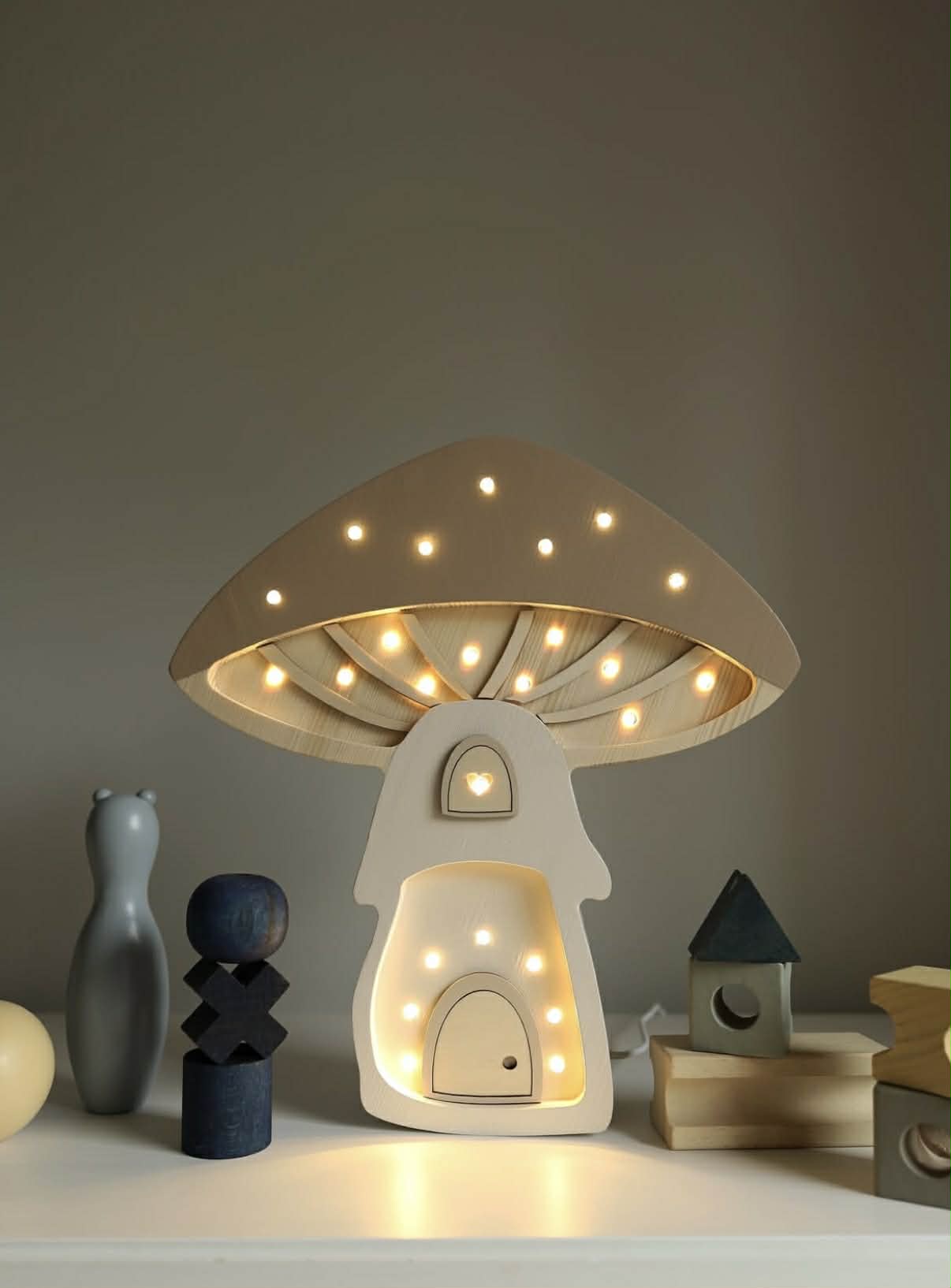 Little Lights Domek Grzybek to wyjątkowa drewniana lampka nocna dla dzieci, ręcznie wykonana z naturalnego drewna sosnowego. Jej bajkowa forma domku w kształcie grzybka przenosi dziecięcy pokój w świat baśni, leśnych przygód i ciepłych wieczornych rytuałów.