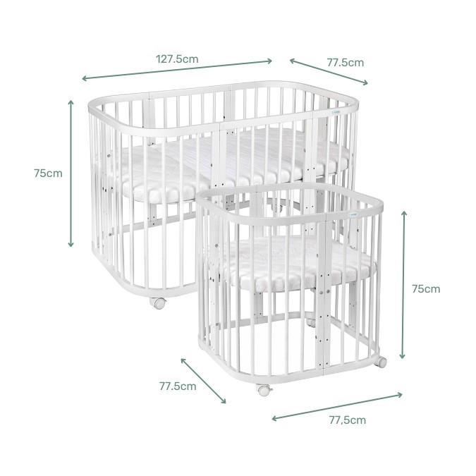 - Mniejsze łóżeczko: wys. 75 cm, szer. 77,5 cm, dł. 77,5 cm