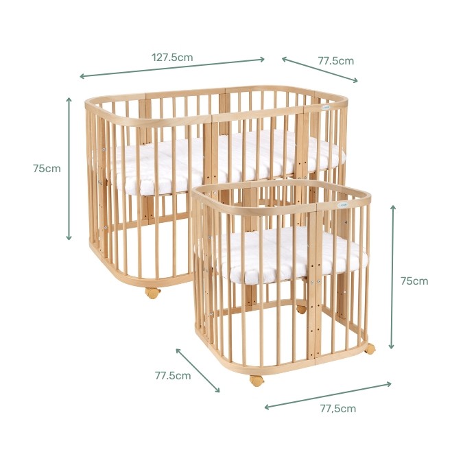 - Mniejsze łóżeczko: wys. 75 cm, szer. 77,5 cm, dł. 77,5 cm