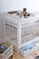 Klasyczne łóżeczko pod materac 120x60cm posiada trzy poziomy wysokości materaca oraz mozliwość demontażu jednego boku (zarówno prawego jak i lewego). W jego miejsce można zamontować oskrzynię (jedna sztuka), dzięki czemu łóżeczko pełni wtedy funkcję otwartego tapczanika dla większego dziecka.