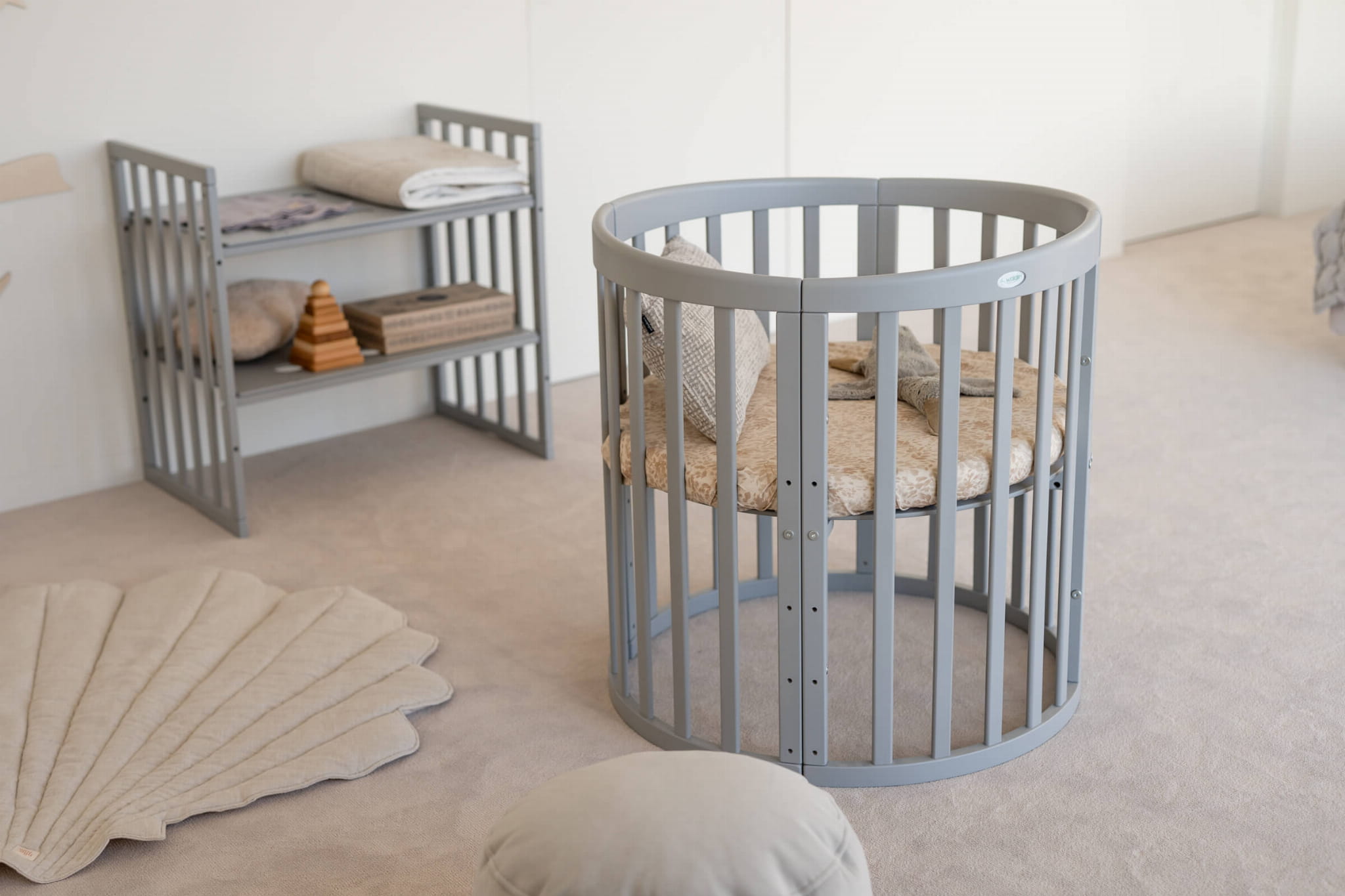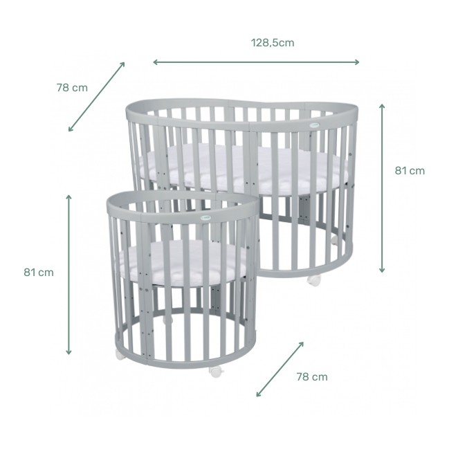Szare, owalne łóżeczko 7w1 dla dziecka – informacje techniczne