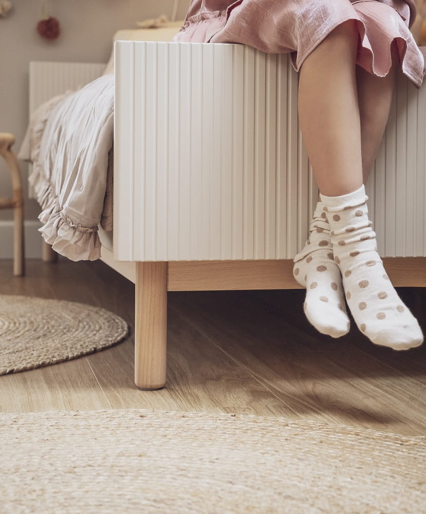 Kolekcja Petite wyróżnia się unikalnym połączeniem estetyki skandynawskiej z akcentami stylu Art Déco. Lekka konstrukcja łóżeczka, znakomite detale oraz elementy z litego drewna bukowego nadają mu wyjątkowego charakteru. Delikatne, włoskie uchwyty w odcieniu zgaszonego złota doskonale współgrają z elegancką szampańską kolorystyką mebli. Wysokość nóżek wynosząca 19,5 cm sprawia, że łóżeczko jest funkcjonalne i praktyczne, na przykład umożliwiając wjazd robota sprzątającego.