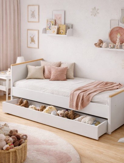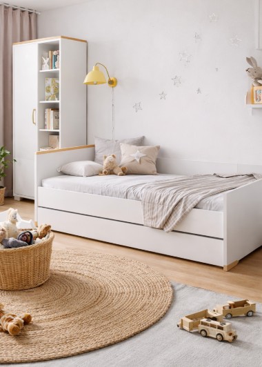Łóżko Pinio Snap oferuje możliwość rozbudowy o praktyczną szufladę, która może służyć jako miejsce do przechowywania pościeli, zabawek lub – po zastosowaniu odpowiedniego materaca – jako drugie miejsce do spania. Dodatkowo istnieje opcja dokupienia barierki zabezpieczającej, zwiększającej bezpieczeństwo dziecka podczas snu.
