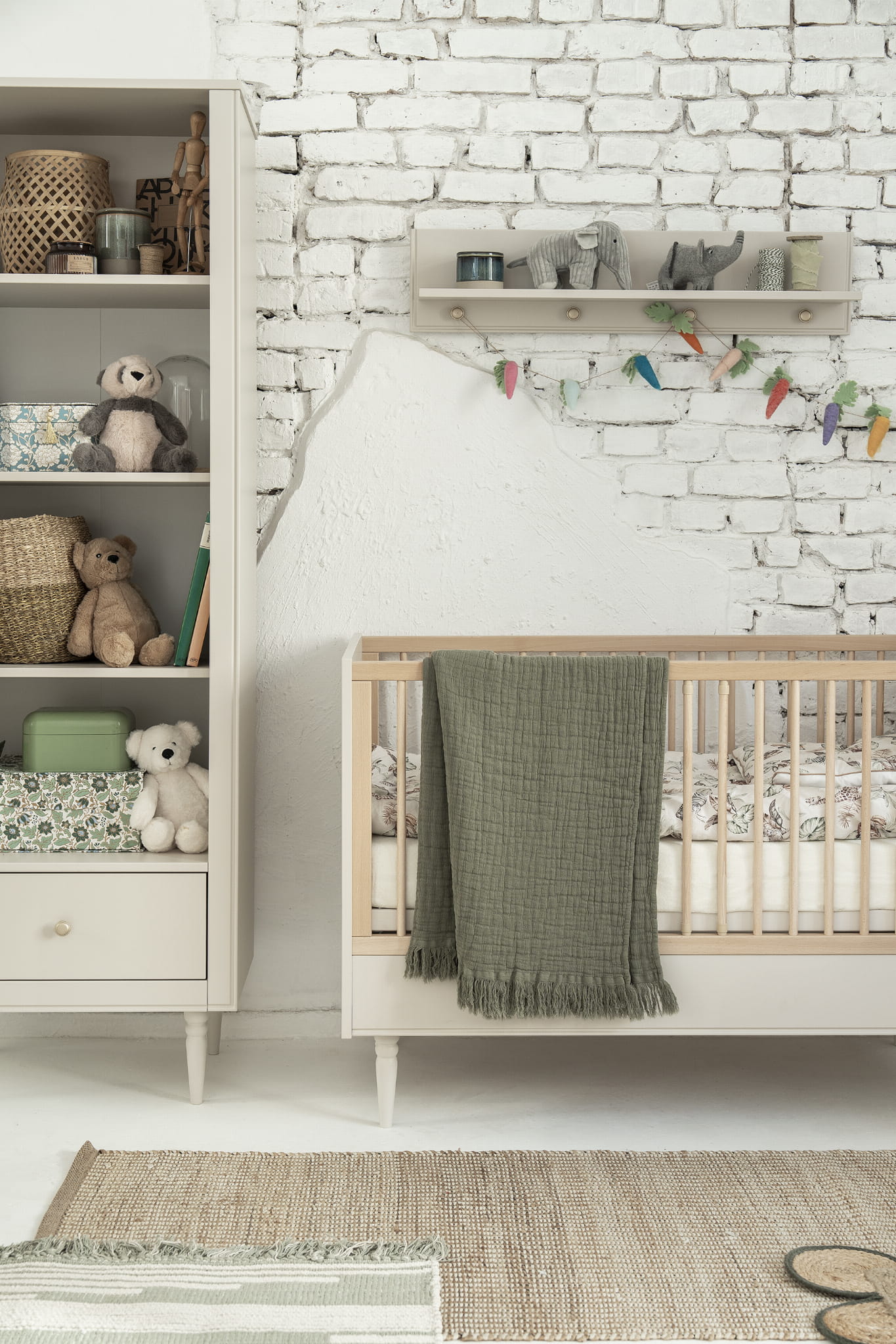 Kolekcja Petite wyróżnia się unikalnym połączeniem estetyki skandynawskiej z akcentami stylu Art Déco. Lekka konstrukcja łóżeczka, znakomite detale oraz elementy z litego drewna bukowego nadają mu wyjątkowego charakteru. Delikatne, włoskie uchwyty w odcieniu zgaszonego złota doskonale współgrają z elegancką szampańską kolorystyką mebli. Wysokość nóżek wynosząca 19,5 cm sprawia, że łóżeczko jest funkcjonalne i praktyczne, na przykład umożliwiając wjazd robota sprzątającego.