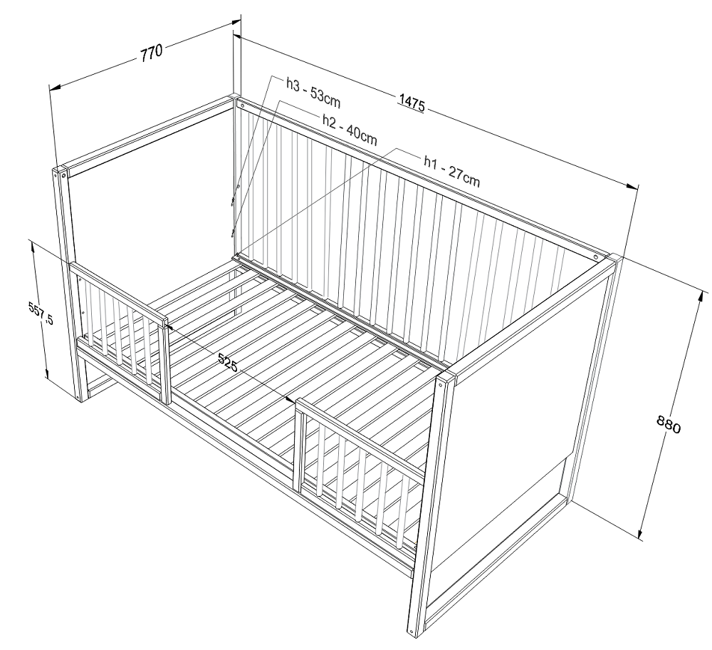 Łóżeczko TWEENS posiada 3 poziomy regulacji materaca, dodatkowo jedna z ramek bocznych posiada 3 wyjmowane lamelki aby umożliwić już starszemu dziecku samodzielne wychodzenie z łóżeczka. Łóżeczko rośnie razem z dzieckiem i zawiera wszystkie potrzebne elementy do przekształcenia w tapczanik dla starszego dziecka.