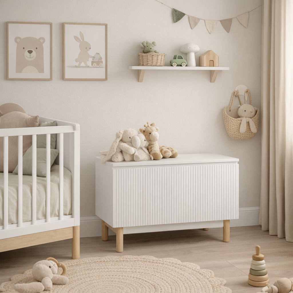 Skrzynia na zabawki Miloo biała – styl, bezpieczeństwo i porządek w pokoju dziecka