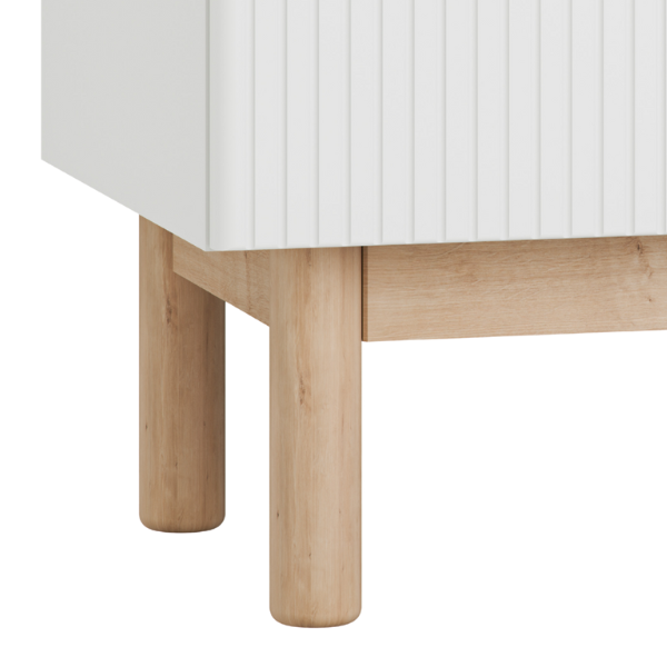 Design kolekcji kładzie nacisk na detal i elegancję – ryflowane fronty dodają charakteru i klasy, zaś delikatnie zaokrąglone narożniki gwarantują bezpieczeństwo młodych użytkowników. Estetyczne metalowe uchwyty oraz drewniane bukowe nóżki nadają meblowi lekkości i finezji.