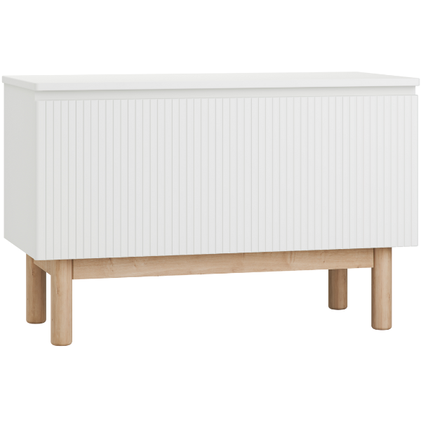 Pojemne wnętrze skrzyni pomieści zabawki, książeczki, klocki czy pluszaki, ułatwiając codzienną organizację przestrzeni. Charakterystyczny front z pionowym frezowaniem nadaje meblowi nowoczesny, a zarazem przytulny wygląd, który świetnie pasuje do pokoju niemowlęcego i dziecięcego.
