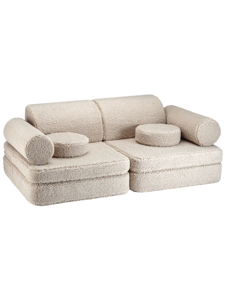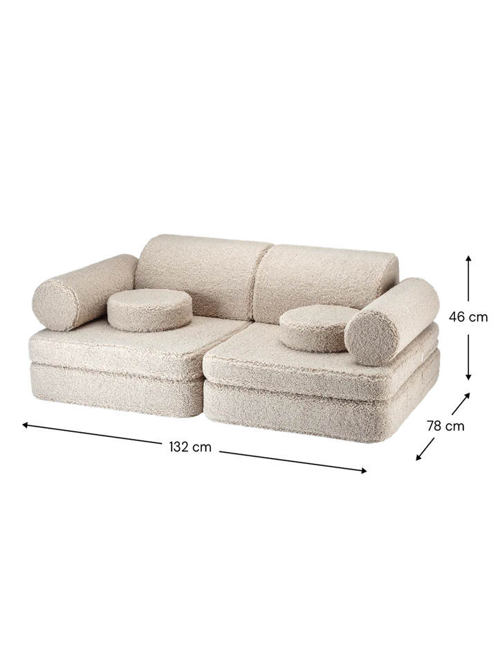 Sofa składa się z 9 części - dwóch poduszek do siedzenia, jednej dużej poduszki do siedzenia, dwóch trójkątnych poduszek jako oparcia, dwóch poduszek w kształcie walca jako podłokietników i dwóch okrągłych poduszek - zapewniając idealne połączenie z nieograniczonym potencjałem do pomysłowej zabawy i relaksu.
