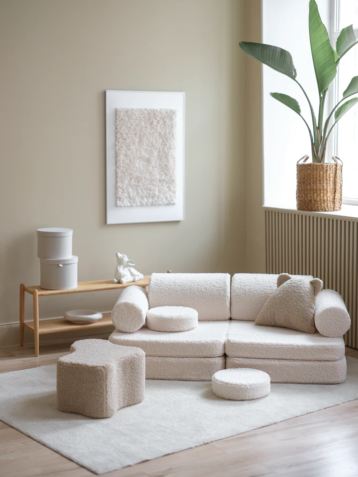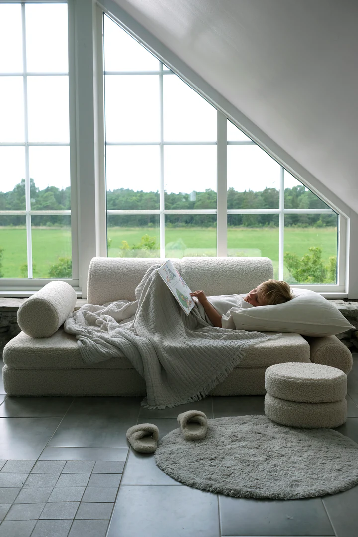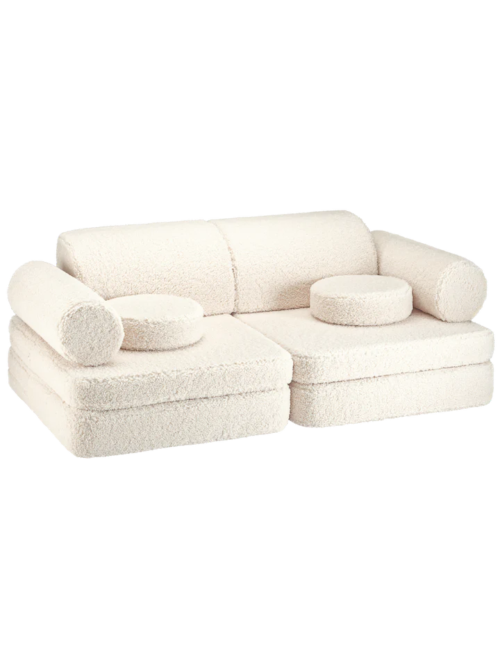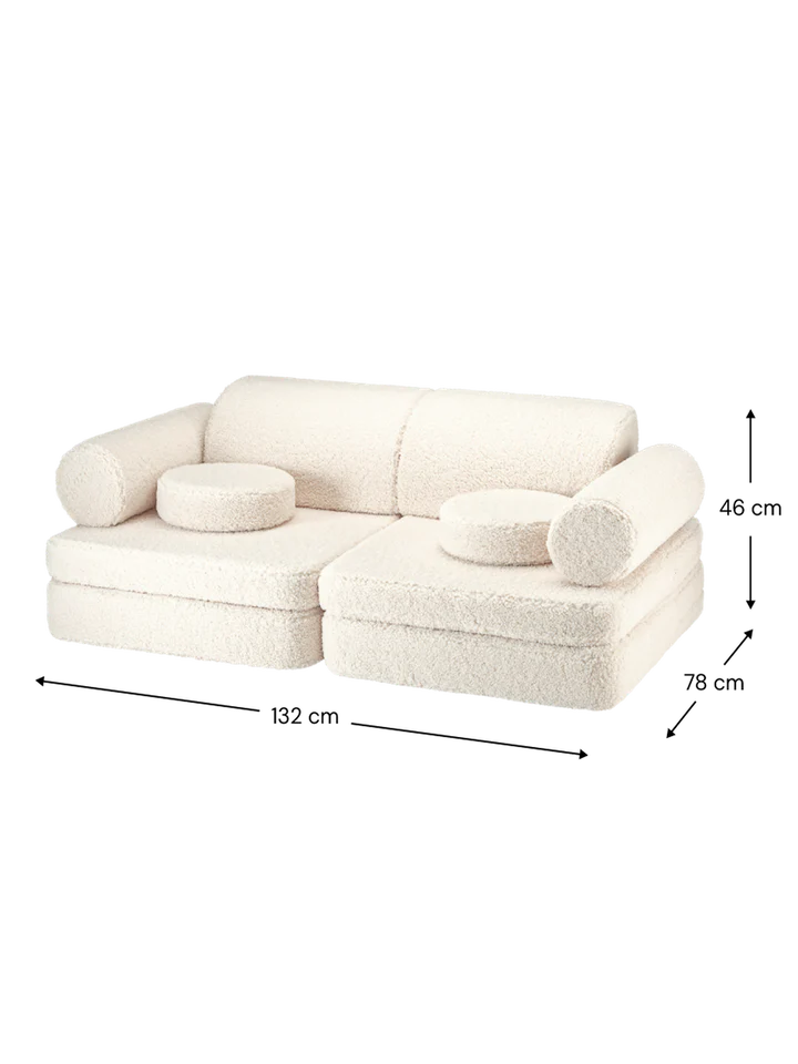 Sofa składa się z 9 części - dwóch poduszek do siedzenia, jednej dużej poduszki do siedzenia, dwóch trójkątnych poduszek jako oparcia, dwóch poduszek w kształcie walca jako podłokietników i dwóch okrągłych poduszek - zapewniając idealne połączenie z nieograniczonym potencjałem do pomysłowej zabawy i relaksu.