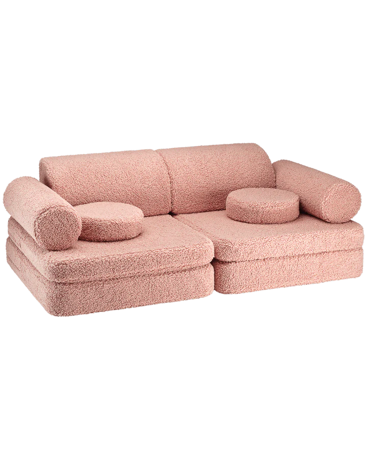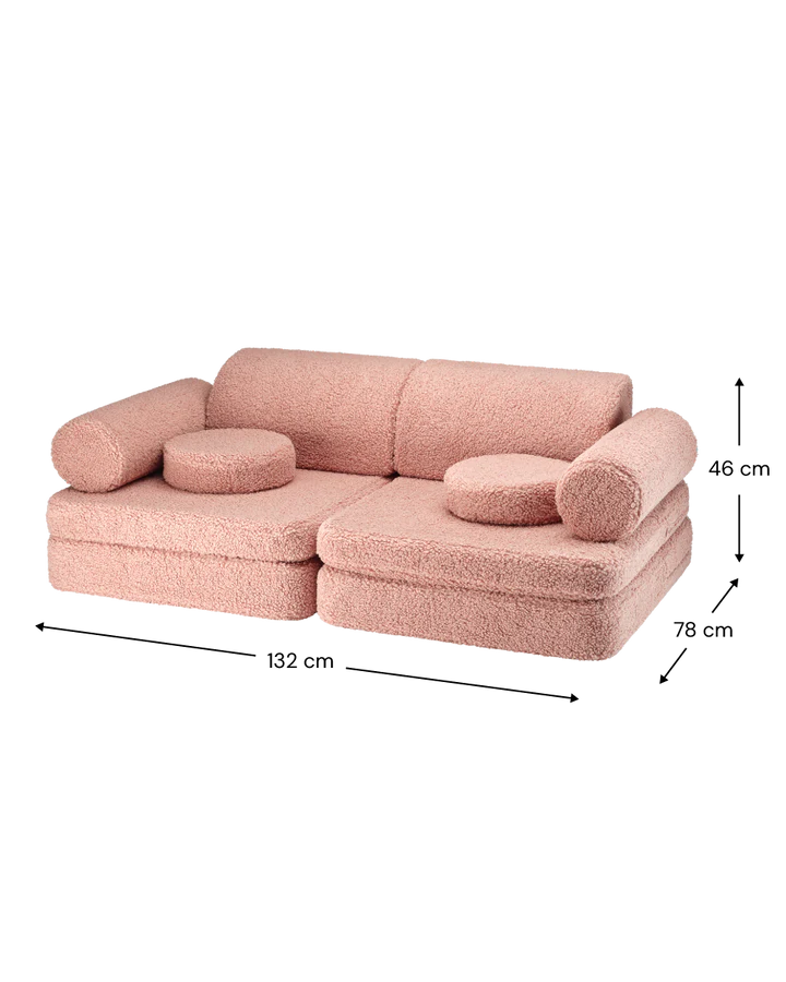 Sofa składa się z 9 części - dwóch poduszek do siedzenia, jednej dużej poduszki do siedzenia, dwóch trójkątnych poduszek jako oparcia, dwóch poduszek w kształcie walca jako podłokietników i dwóch okrągłych poduszek - zapewniając idealne połączenie z nieograniczonym potencjałem do pomysłowej zabawy i relaksu.