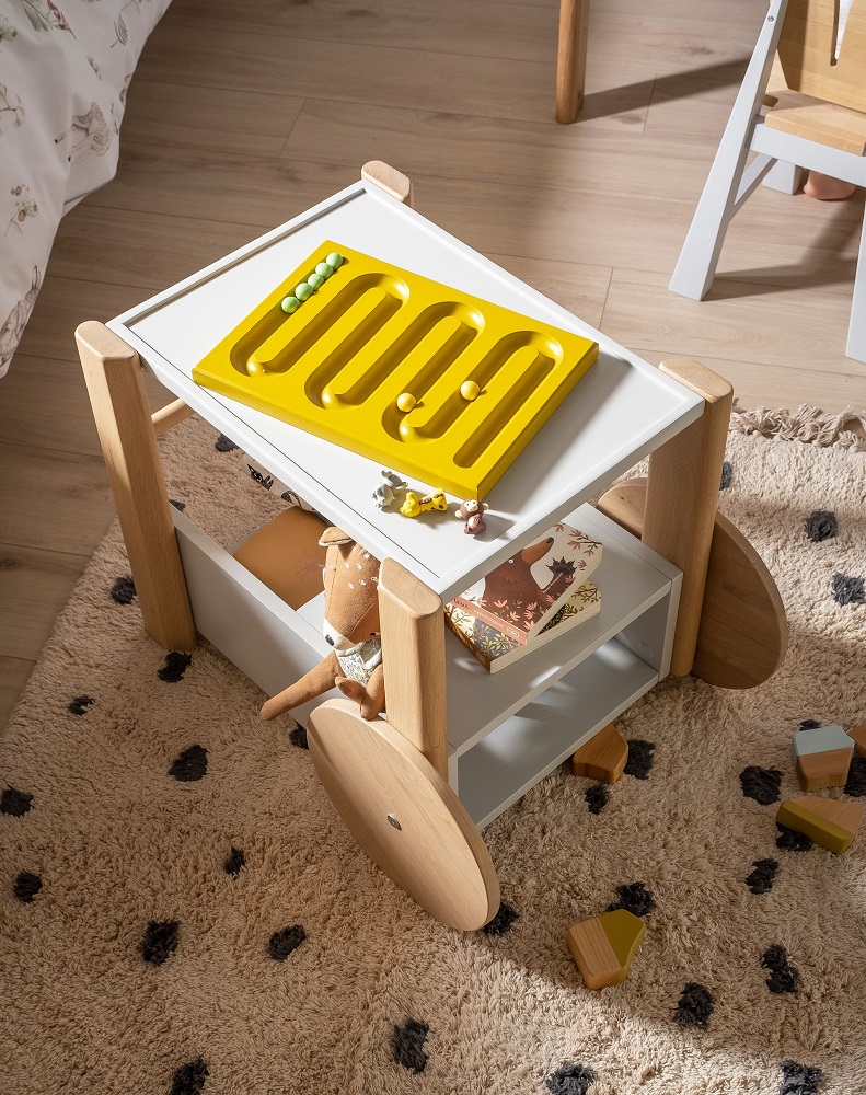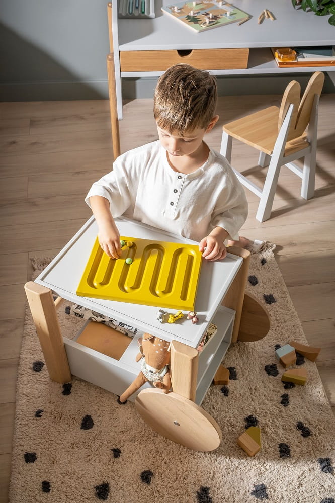 Stolik świetnie sprawdzi się do układania klocków, puzzli lub jako miejsce tworzenia małych dzieł sztuki.
