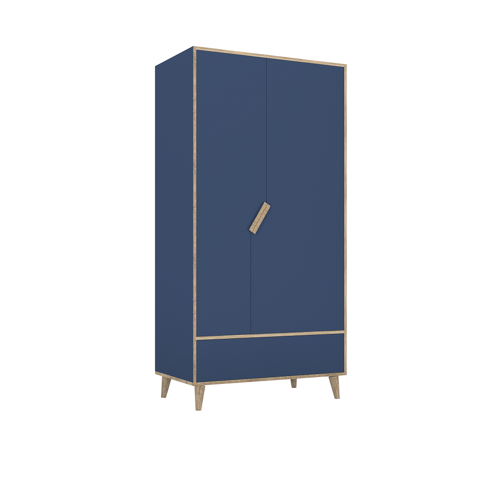 Szafa 2 drzwiowa Bami Tutu Blue posiada zgrabne, drewniane nóżki, które nadają lekkości całej formie. Jest na tyle pojemna żeby pomieścić na prawdę wiele rzeczy. Ubrania, bielizna, pościel, zabawki, książeczki – szafa Tutu Blue pozwala na wygodną organizację ubrań oraz wszelkich akcesoriów i bez wątpienia stanie się sprzymierzeńcem w utrzymywaniu harmonii i porządku w pokoju dziecka. Jest Podzielona na dwie części. W pierwszej znajduje się 5 półek z opcją regulacji. W drugiej części znajdują się 2 drążki oraz 1 większa półka. Poniżej drzwi znajduję się pojemna szuflada.