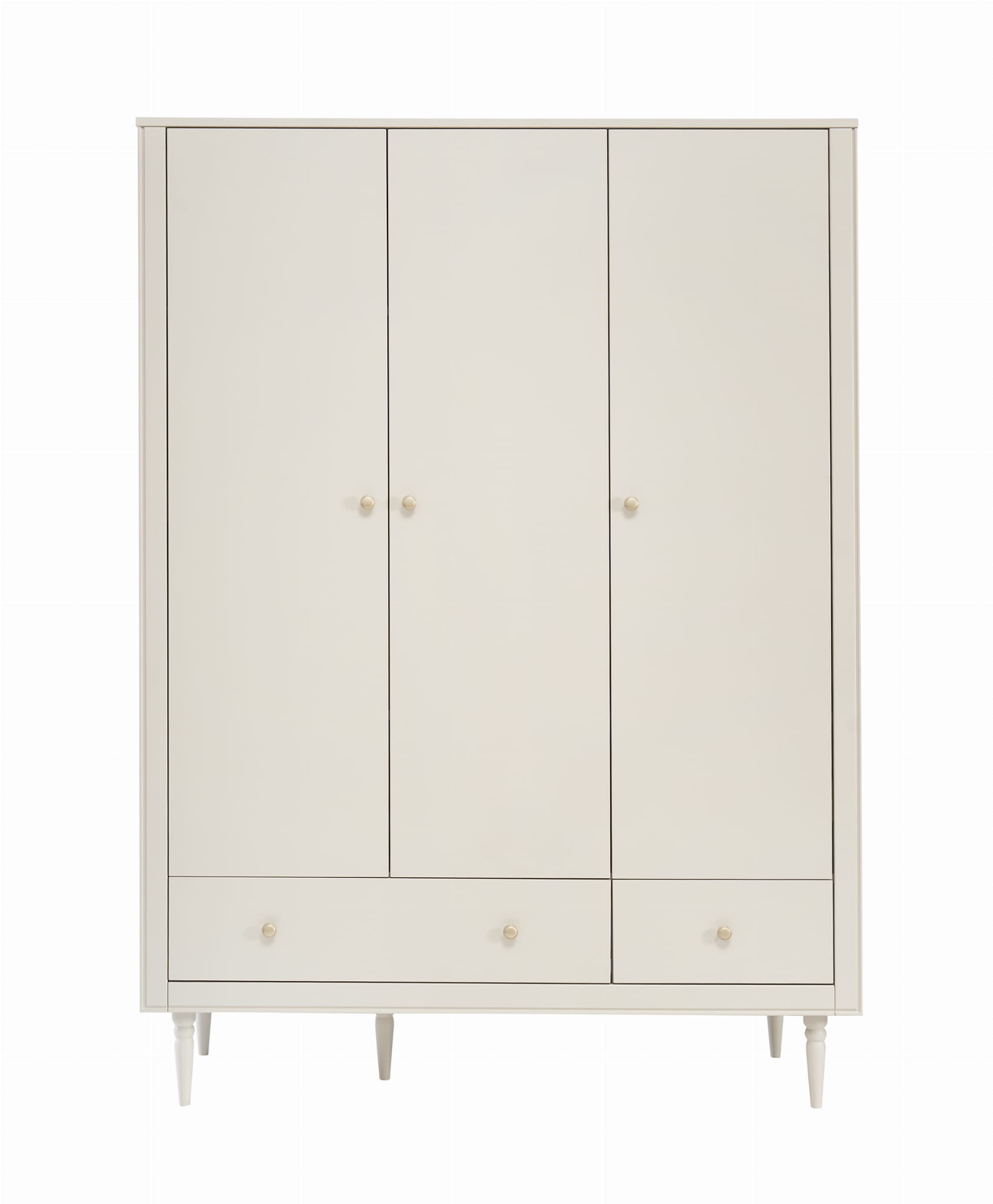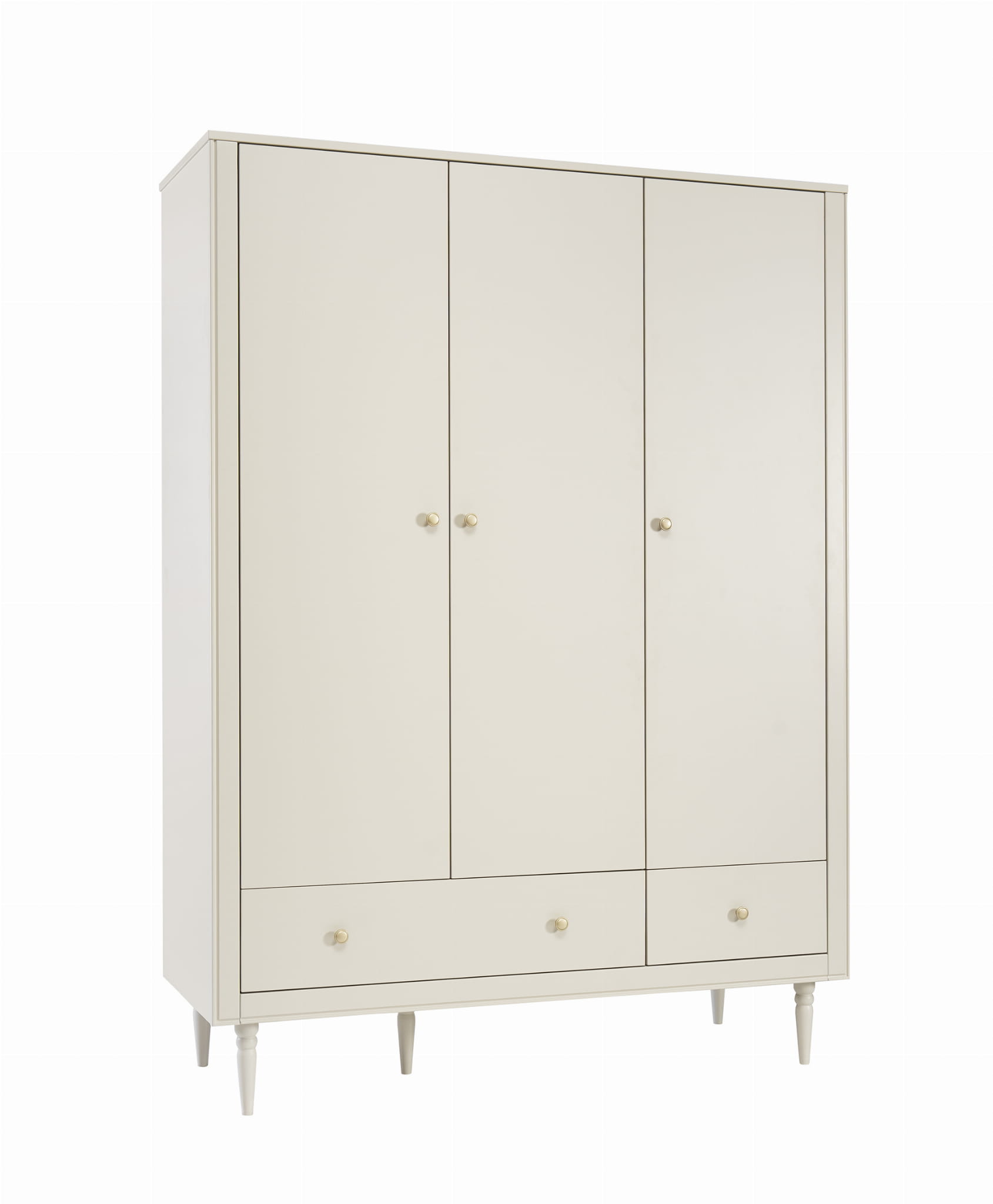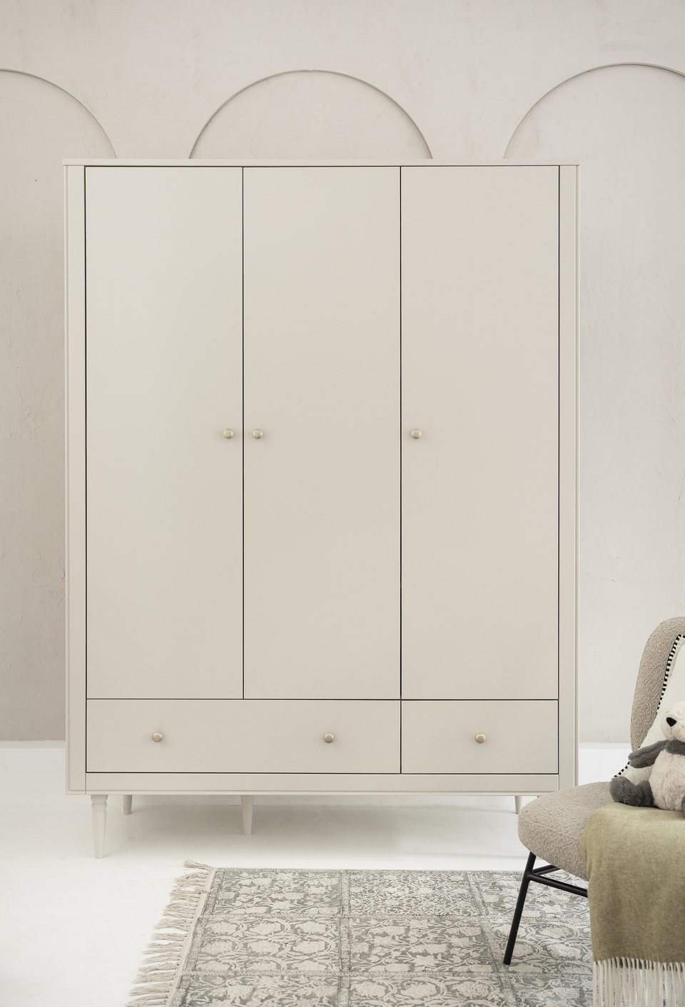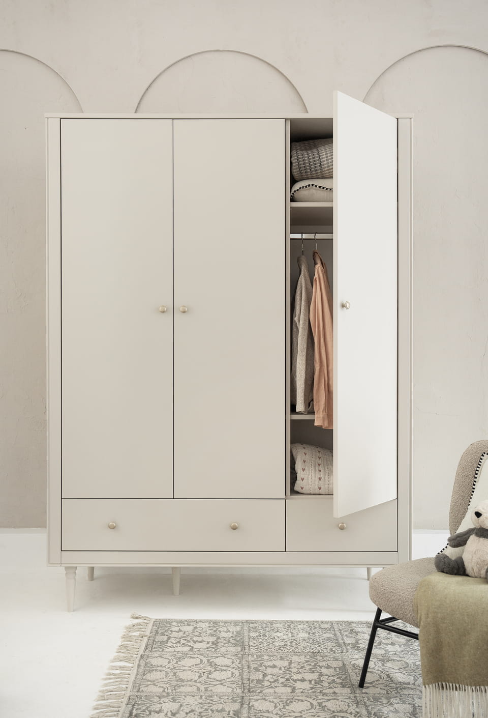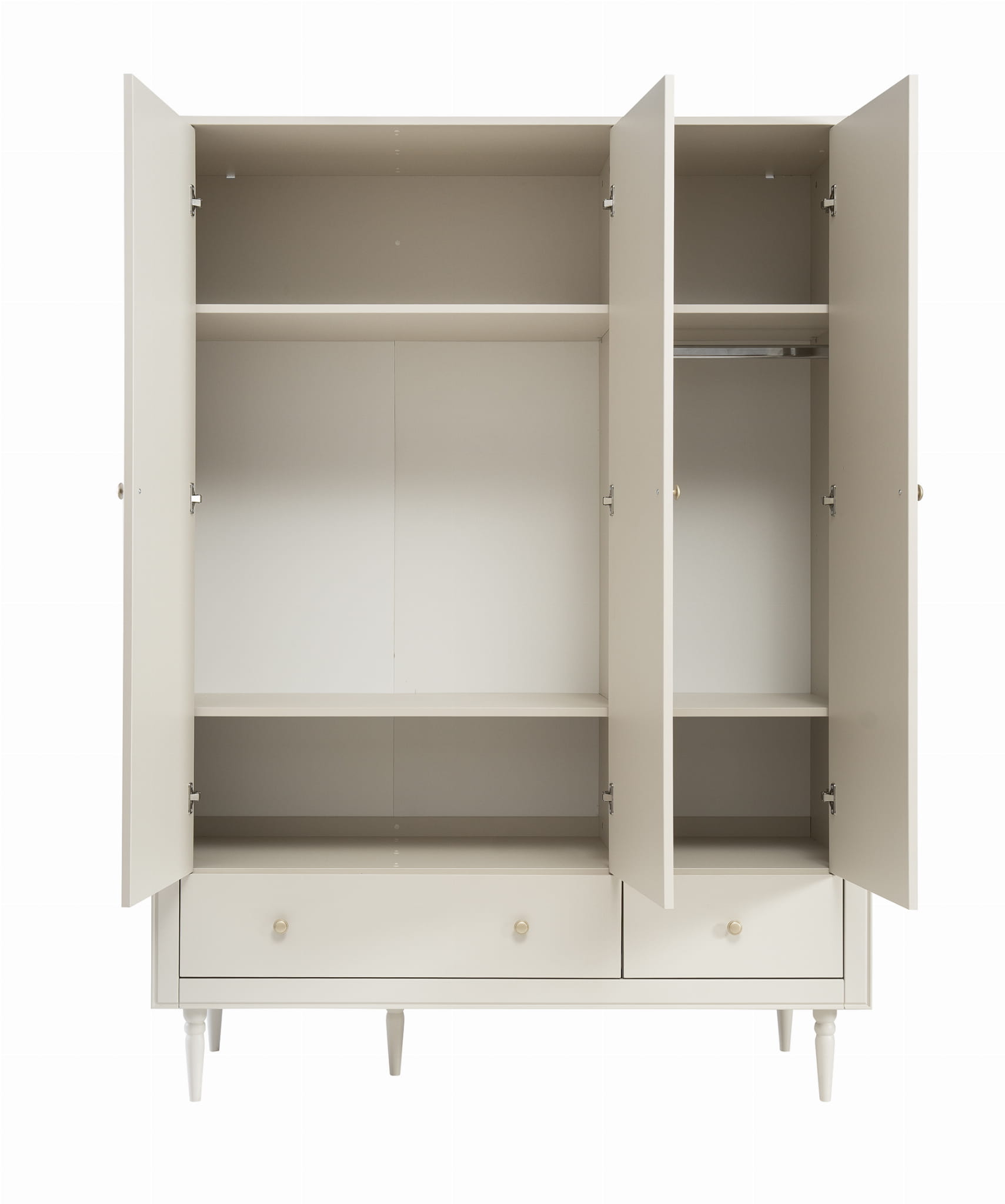 Trzydrzwiowa szafa w klasycznym stylu z kolekcji Petite posiada wysokiej jakości system cichego zamykania. Wnętrze szafy zostało zaprojektowane z myślą o praktycznym przechowywaniu ubrań i akcesoriów.