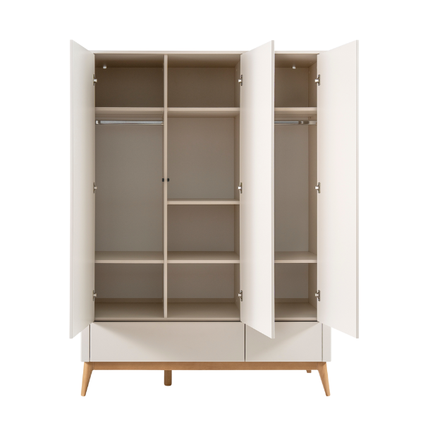 Elegancka szafa trzydrzwiowa z kolekcji Seth to połączenie funkcjonalności i ponadczasowego designu. Wyposażona w troje drzwi oraz dwie szuflady w systemie push-to-open, oferuje wygodę codziennego użytkowania bez uchwytów. Wnętrze zostało podzielone dwiema pionowymi przegrodami, tworząc siedem regulowanych półek oraz dwa drążki na ubrania. Dodatkowo istnieje możliwość dokupienia dwóch dodatkowych półek do części bocznych, co pozwala jeszcze lepiej dopasować układ szafy do indywidualnych potrzeb.