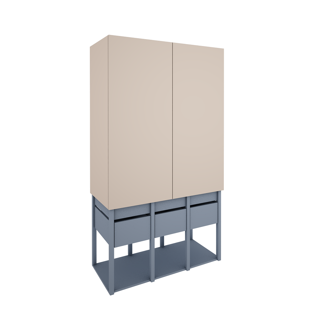 Piękna, klasyczna szafa w kolorze piaskowego beżu z dodatkiem zgaszonego niebieskiego. Szafa zaprojektowana jest tak aby zapewnić jak najwięcej miejsca do przechowywania. Po prawej stronie znajduje się przestrzeń przeznaczona do wieszania ubrań wyposażona w jeden drążek i półki natomiast po lewej cztery pojemne półki. Na dole są trzy szuflady oraz poniżej trzy półki.