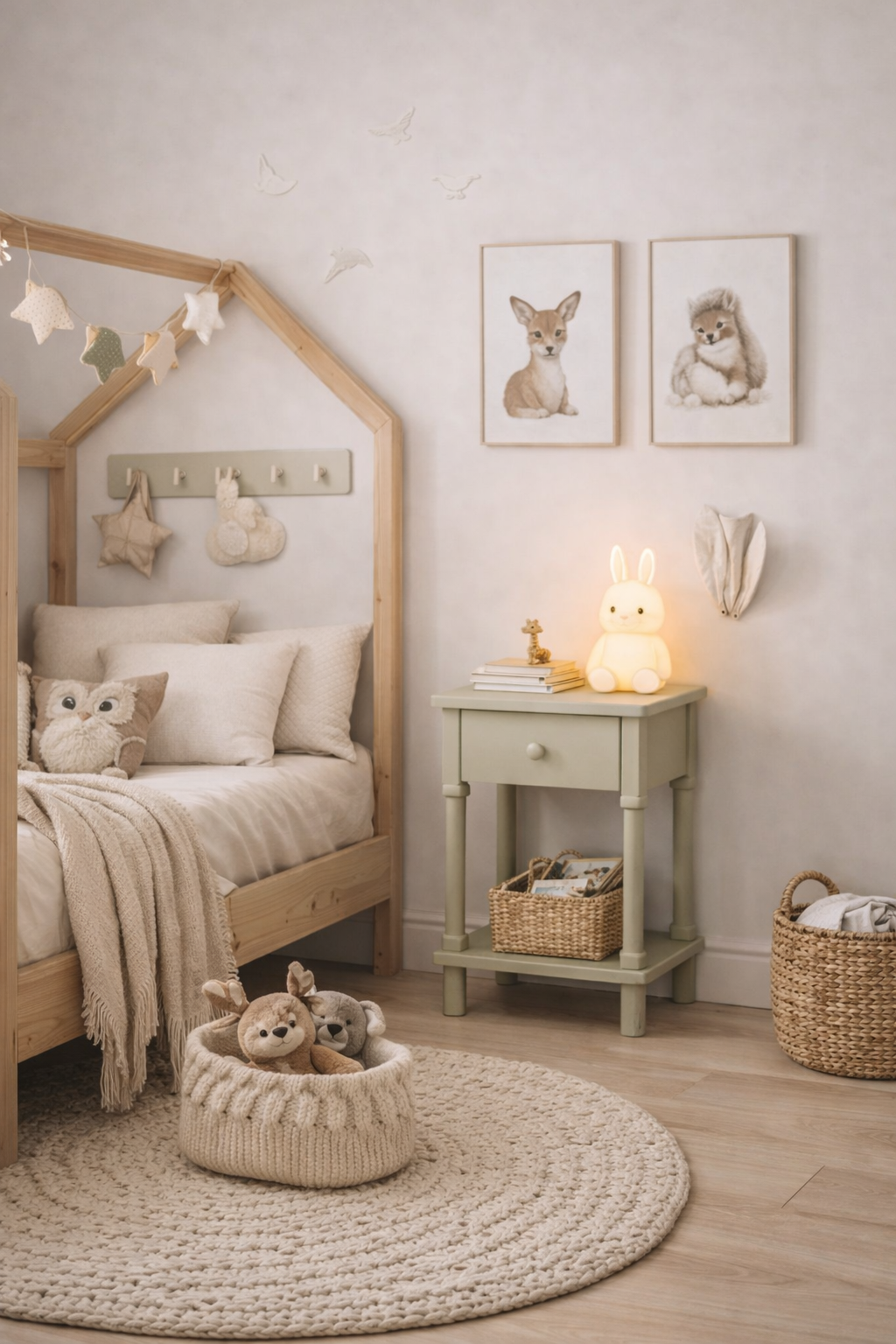Oliwkowa szafka nocna do pokoju dziecka - styl boho i naturalne kolory