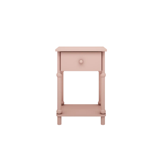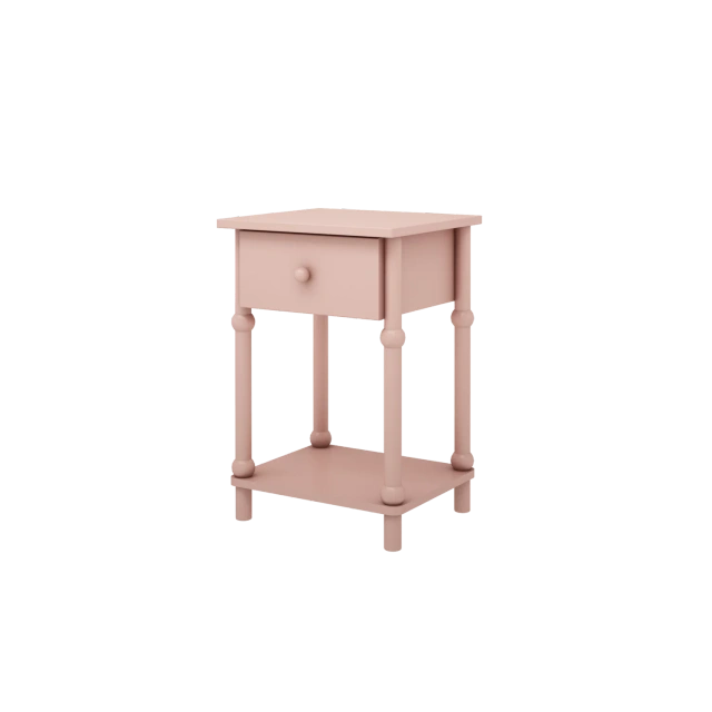 Dekoracyjne falbany na cokole oraz smukłe nóżki z drewna bukowego nadają meblowi artystyczny, rękodzielniczy charakter i sprawiają, że różowa szafka nocna staje się również elementem dekoracyjnym pokoju dziecka.