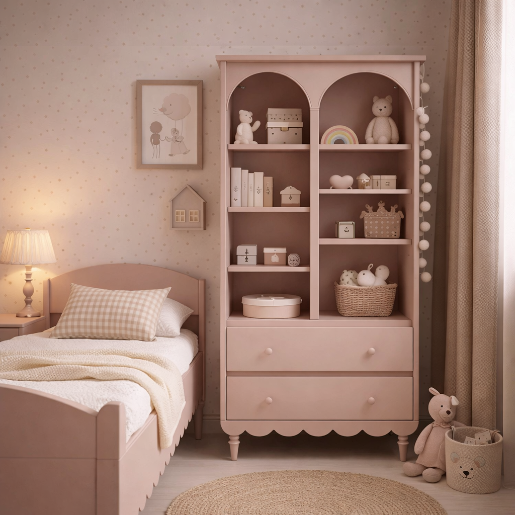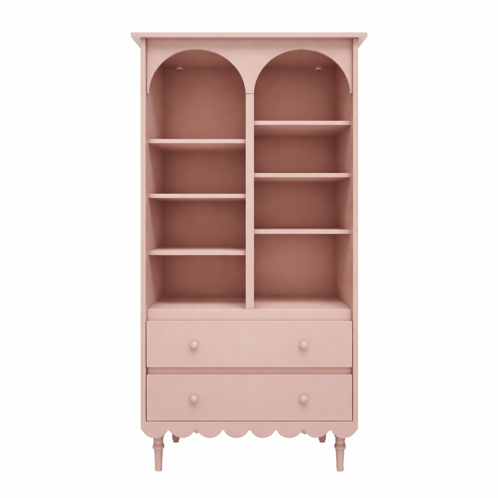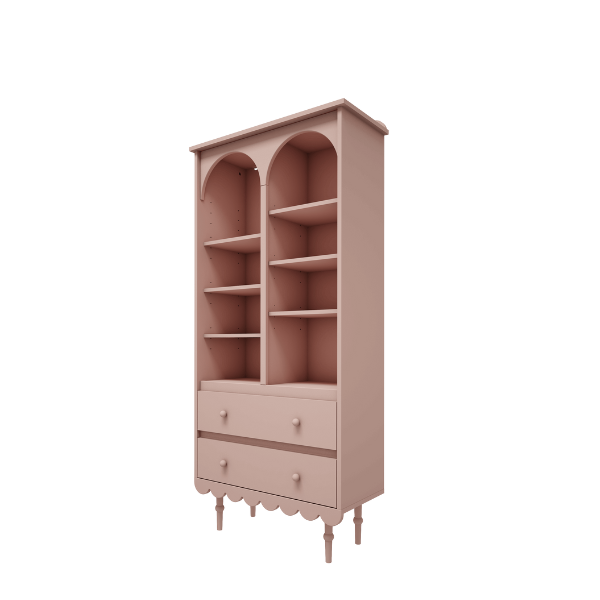 Klasyczny design połączony z subtelnym pastelowym odcieniem sprawia, że regał pasuje zarówno do tradycyjnych, jak i nowoczesnych aranżacji dziecięcych wnętrz. Charakterystyczna falbanka u podstawy nadaje mu lekkości i wyróżnia kolekcję Babushka.