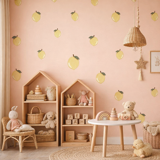 Tapeta doskonale sprawdzi się w różnych aranżacjach - szczególnie dobrze wygląda w połączeniu z dodatkami w kolorze różowym, żółtym lub naturalnym drewnem. Dzięki temu tapeta dziecięca w cytryny będzie idealna zarówno do pokoju dziewczynki, jak i do jasnych, przytulnych wnętrz inspirowanych stylem skandynawskim lub vintage.