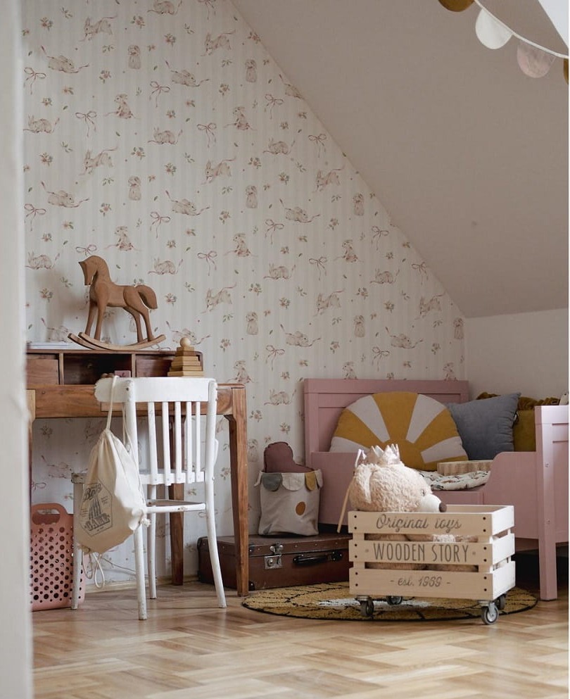To idealny wybór dla rodziców, którzy szukają tapety dziecięcej w króliczki do pokoju niemowlęcia, łączącej subtelny wzór, pastelową kolorystykę i bajkowy charakter wnętrza.