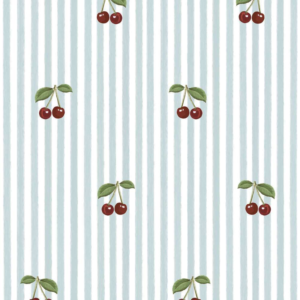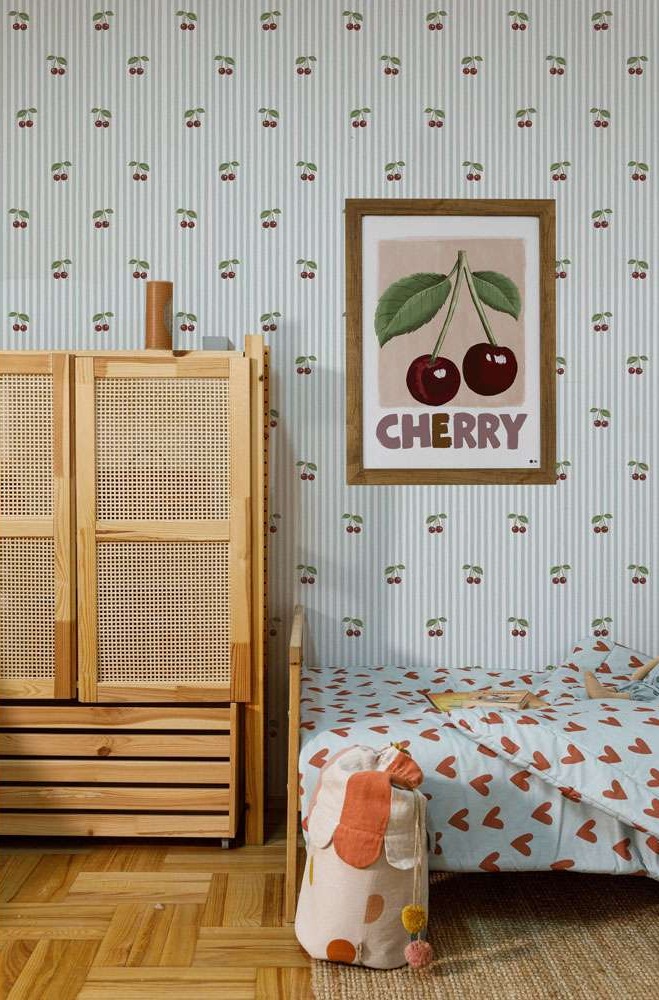 Tapeta dziecięca w wisienki na niebieskich paskach to wyjątkowy wzór, który łączy klasyczne pionowe paski z uroczym motywem owoców. Na jasnym niebieskim tle pojawiają się drobne wisienki w głębokim czerwonym kolorze z delikatnymi zielonymi listkami. Każda z nich ma około 6 cm, dzięki czemu wzór jest subtelny i lekki, idealny do dziecięcego wnętrza.